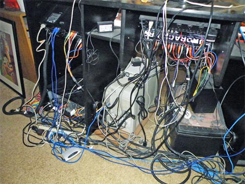 This is what the main production desk looked like from the rear. It’s been cleaned up and improved since this photo. The rack mounted Intel box is visible at the lower left. The light gray box in the middle is the retired Macintosh G3. It’s still there since once in a while we need to resurrect old project files that run in Metro or Opcode Vision that are Mac only.