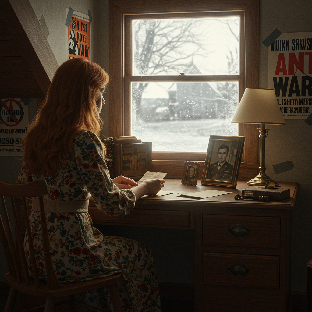 “photorealistic illustration described as follows: a young woman aged 18 – 20 sits at a desk facing away from the viewer. It’s a small room, probably on the second floor. Her hairstyle and clothing indicates the date and location is late 1960s or early 1970s America. In front of her is a window showing a winter landscape. She’s reading a letter. On the desk is a small framed photo of a smiling young man in a US Army uniform. There are a couple posters on the wall of the room protesting the Vietnam war.”