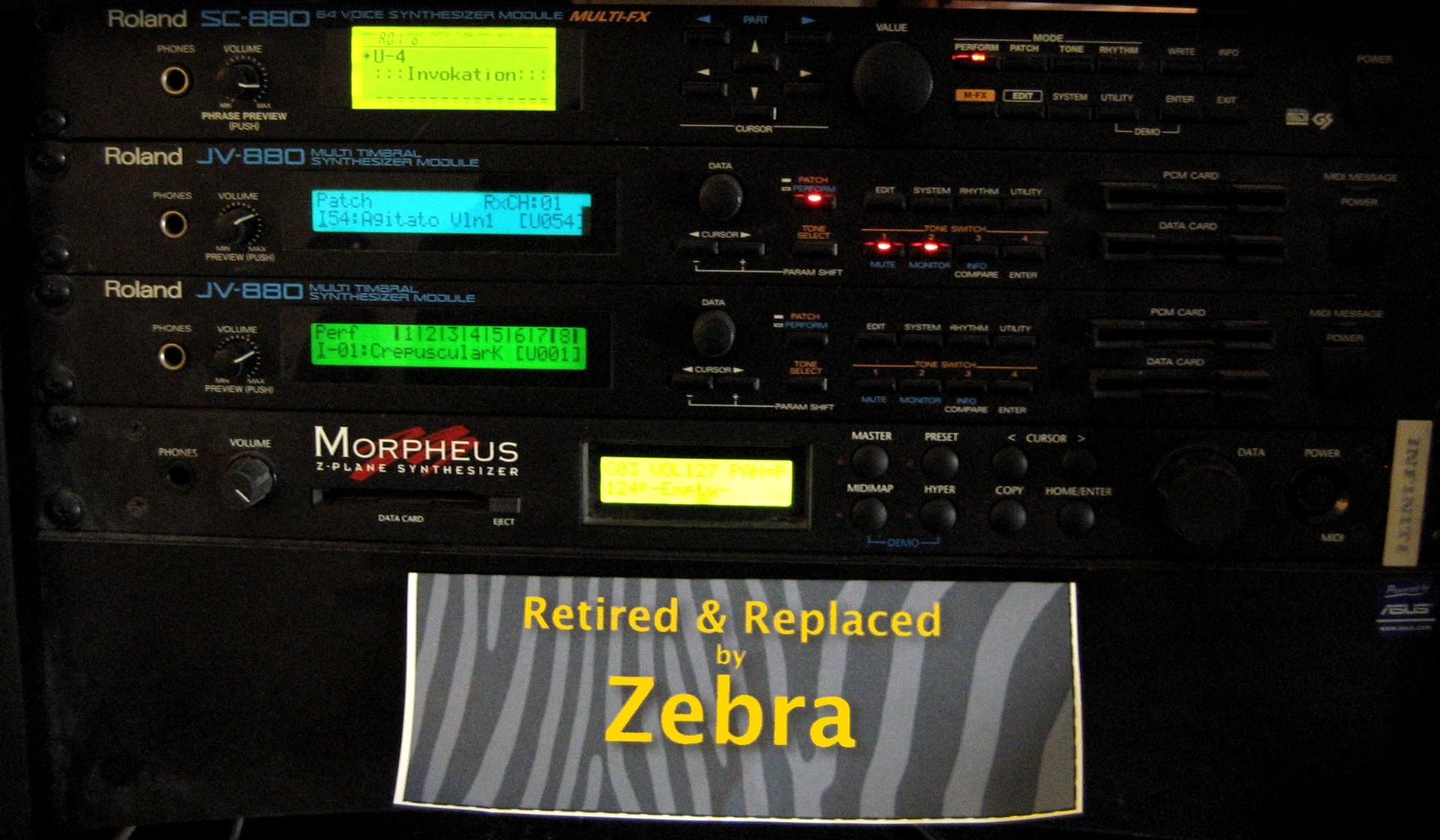 Herr Heckmann has a great promotion: replacing your dinosaurs with a Zebra. You can apply for a discount on Zebra 2 by sending him a photo of your old hardware synths with a label “retired by Zebra”. (See this page for more on Zebra.)